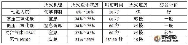 綜合以上參數(shù),可以發(fā)現(xiàn)七氟丙烷在滅火效能相較其他系統(tǒng)出色,應用于配電室、機房等場所時,能在很短時間內將初始火情撲滅。