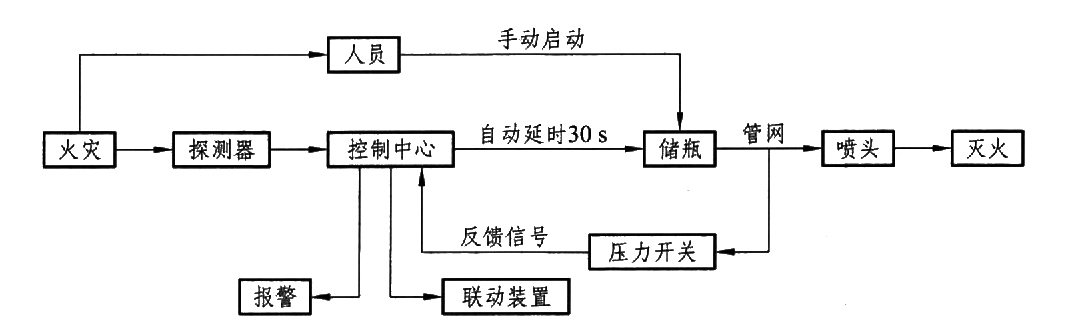 氣體滅火系統(tǒng)的工作原理是:防護區(qū)一旦發(fā)生火災,首先火災探測器報警,消防控制中心接到火災信號后,啟動聯(lián)動裝置(關閉通風口、停止空調等),延時約30s后,打開啟動氣瓶的瓶頭閥,利用氣瓶中的高壓氮氣將滅火劑儲存容器上的容器閥打開,滅火劑經(jīng)管道輸送到噴頭噴出實施滅火。這中間的延時是考慮防護區(qū)內(nèi)人員的疏散。另外,通過壓力開關監(jiān)測系統(tǒng)是否正常工作,若啟動指令發(fā)出而壓力開關的信號遲遲不返回,說明系統(tǒng)故障,值班人員聽到事故報警,應盡快到儲瓶間,手動開啟儲存容器上的容器閥,實施人工啟動滅火。氣體滅火系統(tǒng)滅火過程框圖如圖所示。