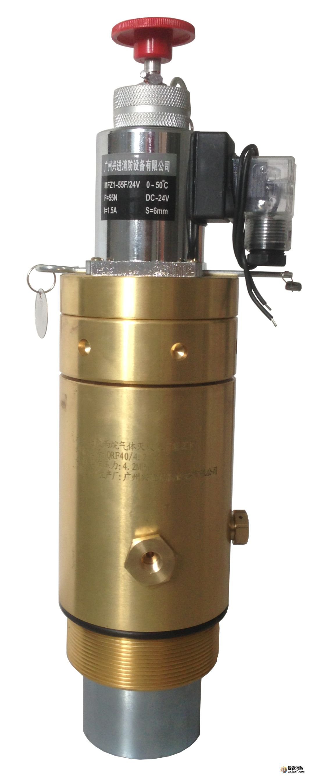 由閥體、電磁鐵、安全檔片、出口接頭、壓力顯示部件、泄壓裝置等組成,接上虹吸管后安裝在貯存容器瓶口上,由電磁鐵電動(dòng)開啟容器閥釋放滅火劑。