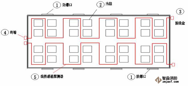 在收塵器的探測(cè)中通常做法是安裝纜式線(xiàn)性差定感溫探測(cè)器,基本是圍繞收塵器“奶柄根部”的水平位置布置,若有爆炸發(fā)生時(shí)此種探測(cè)器是否被炸斷,此處置懷疑態(tài)度。另外收塵器的“內(nèi)膽”著火后溫度和火焰會(huì)向上擴(kuò)散,側(cè)位布置探測(cè)器溫度探測(cè)速度是否達(dá)到事半功倍之效果更值得懷疑。目前很多收塵器都采用高密度小型內(nèi)膽方式,若在內(nèi)膽正上方布置會(huì)給更換內(nèi)膽和探測(cè)器安裝帶來(lái)不便,但要是按照下圖來(lái)布置的話(huà),探測(cè)器探測(cè)密度和探測(cè)速度上是有很大優(yōu)勢(shì)的。另外探測(cè)環(huán)境溫度再在各“斗部”加裝感溫棒檢測(cè)環(huán)境溫度。若利用目前市場(chǎng)上出現(xiàn)的空氣管線(xiàn)性感溫探測(cè)器及可以探測(cè)環(huán)境溫度,又可以起到差定溫之效果,另外抗爆能力和抗老化都有其不可替代的功能。
