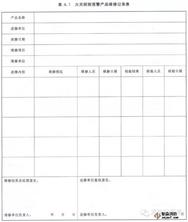 3.1.6承擔維修的企業(yè)應做好維修記錄,與產品使用或管理單位各執(zhí)一份,并保存至該產品報廢?;馂奶綔y報警產品維修記錄表的格式參見附錄A。