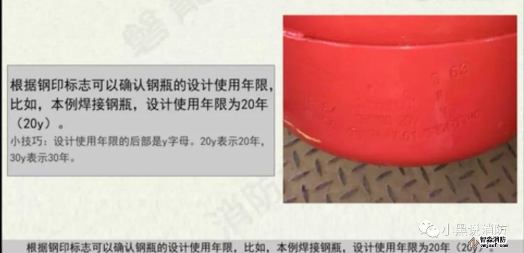 根據(jù)規(guī)程中表3-5,氣體滅火系統(tǒng)的儲氣瓶有無縫鋼瓶和焊接鋼瓶,使用年限分別為30年和20年,而這些數(shù)據(jù)根據(jù)該規(guī)程要求在出廠時應(yīng)作為永久性標志刻在鋼瓶瓶身,仔細觀察,可以在瓶身上看到氣瓶的設(shè)計使用年限。
